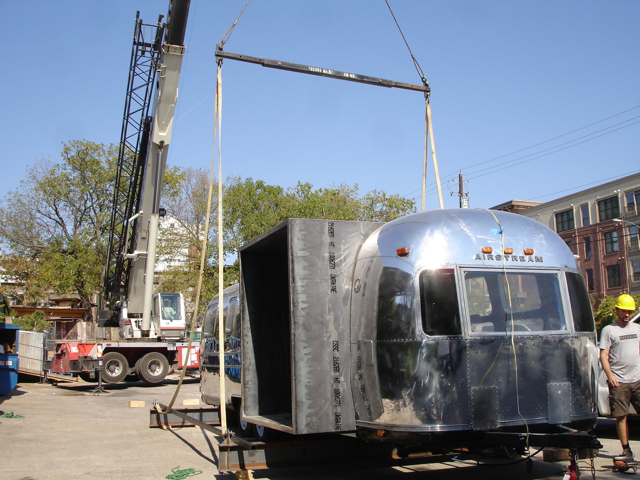 Lifting the Stubb's Green Room over power lines and treetops to its final resting place...nothing to worry about, the power lines only supplied Austin's 911 Call Center. Pfew!